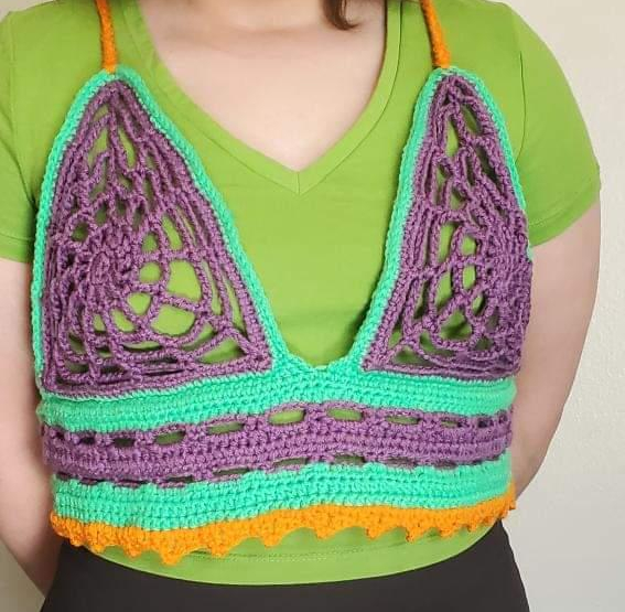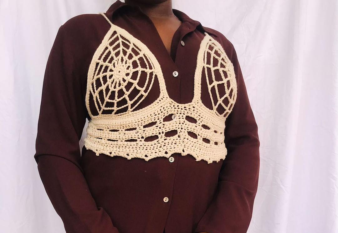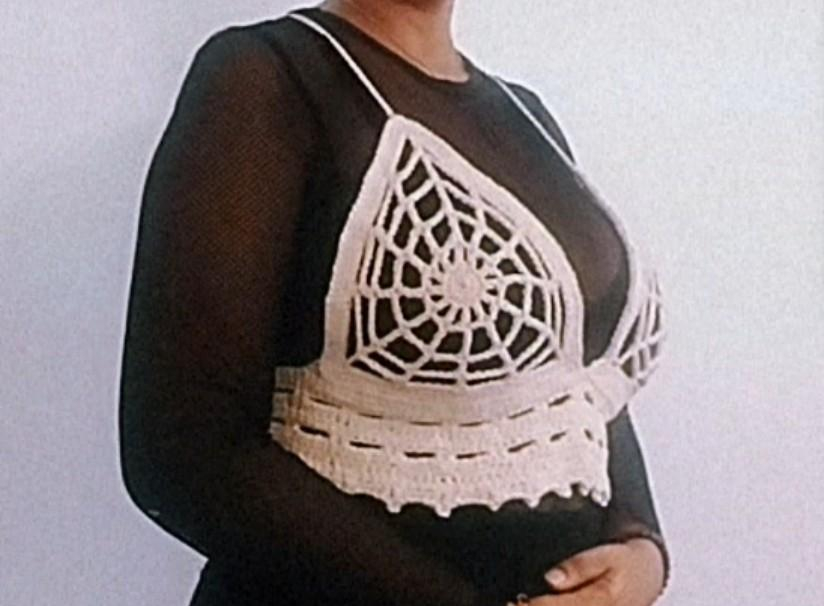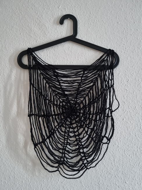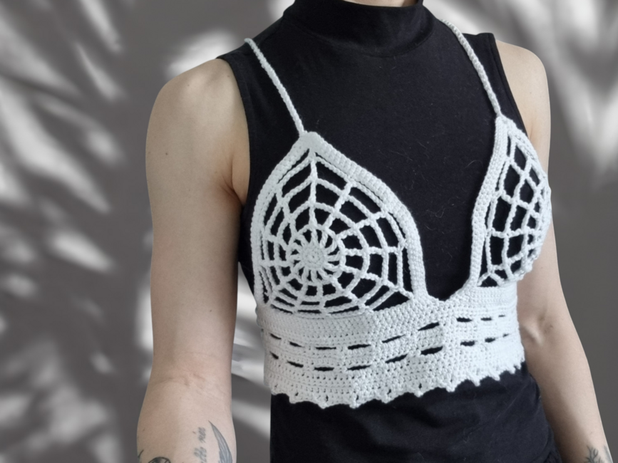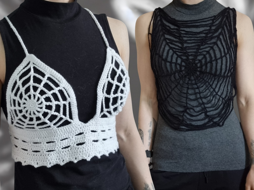 The bundle contains the spider web bustier (white) which fits sizes XS to L (one sized with lacing at the back) and the spider web top (black) which has a flat measurement of 40 x 40 cm but can easily be adjusted to be bigger or smaller!