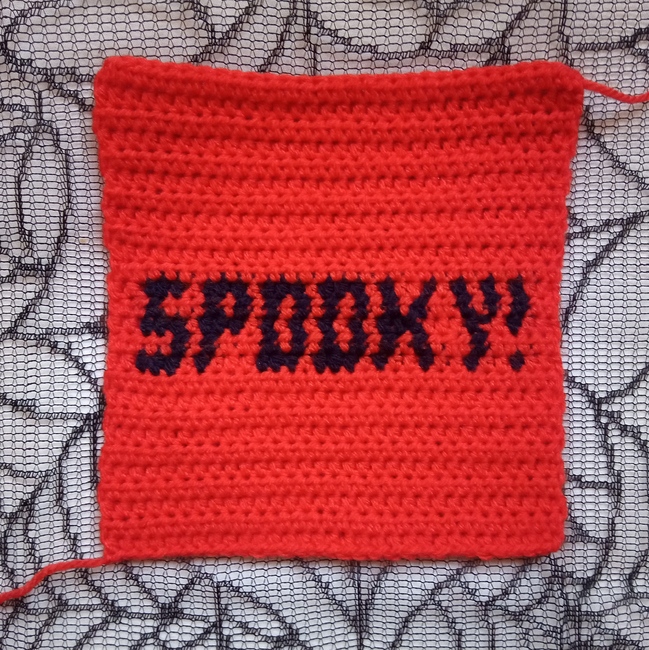 This square can be used by itself to make bags, coasters etc, but also is part of my Spooky season (not) ugly sweater. If you are interested in that check out the sweater pattern in my shop!