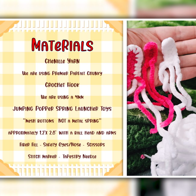 - Chenille Yarn(weight 6) - Crochet Hook(4mm) - Fiber Fill - Scissors - Stitch marker - Tapestry Needle - Jumping Popper Spring Launcher Toys