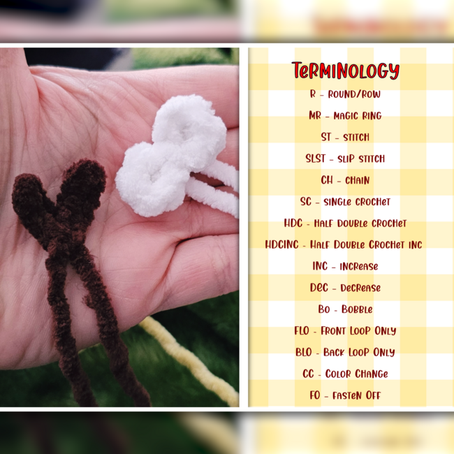- Crocheting in spiral - Magic ring - Chain - Single crochet - Half Double Crochet - Half Double Crochet Increase - Bobble - FLO - BLO - CC - Increase - Decrease - Color Change - Fasten off