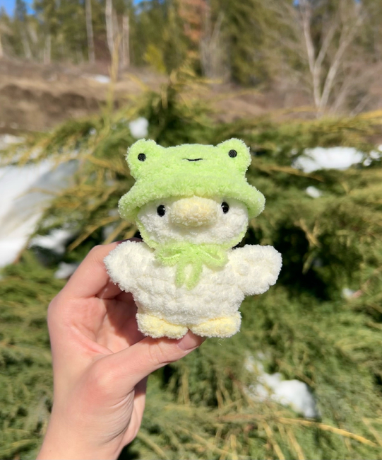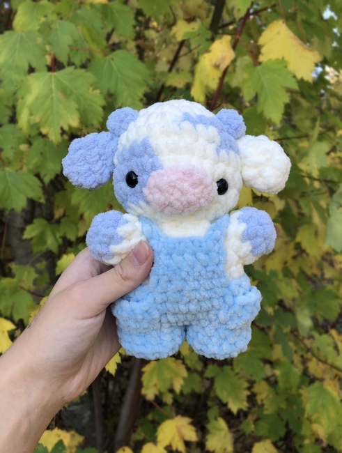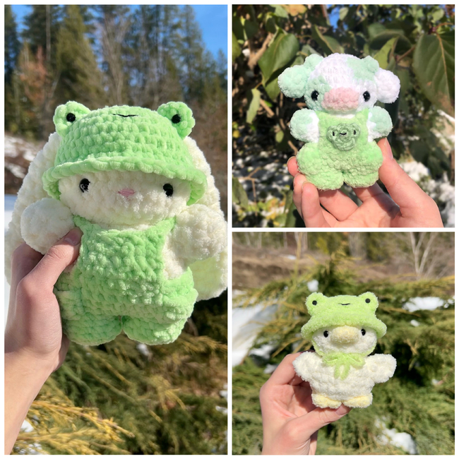 This bundle includes 3 patterns: A baby dungaree cow, a baby bunny in overalls + hat, and a duckling in hat!