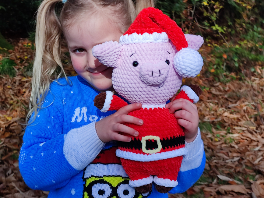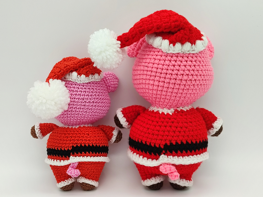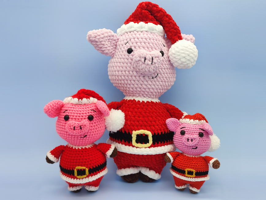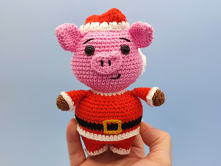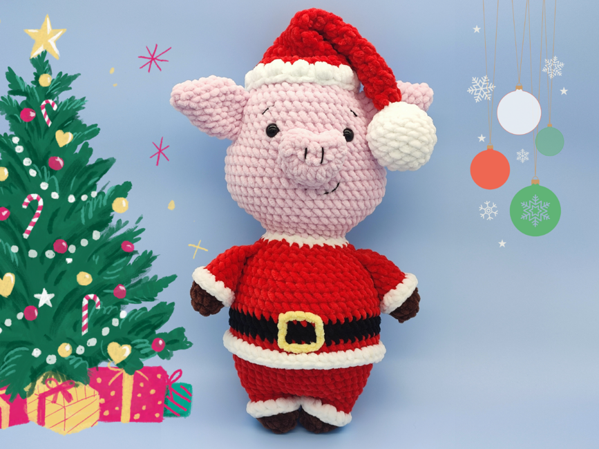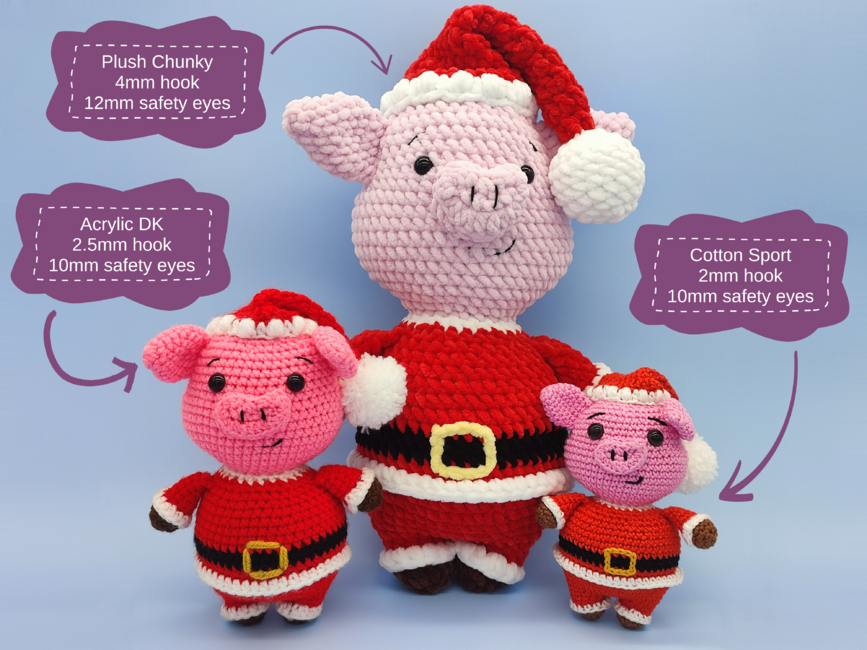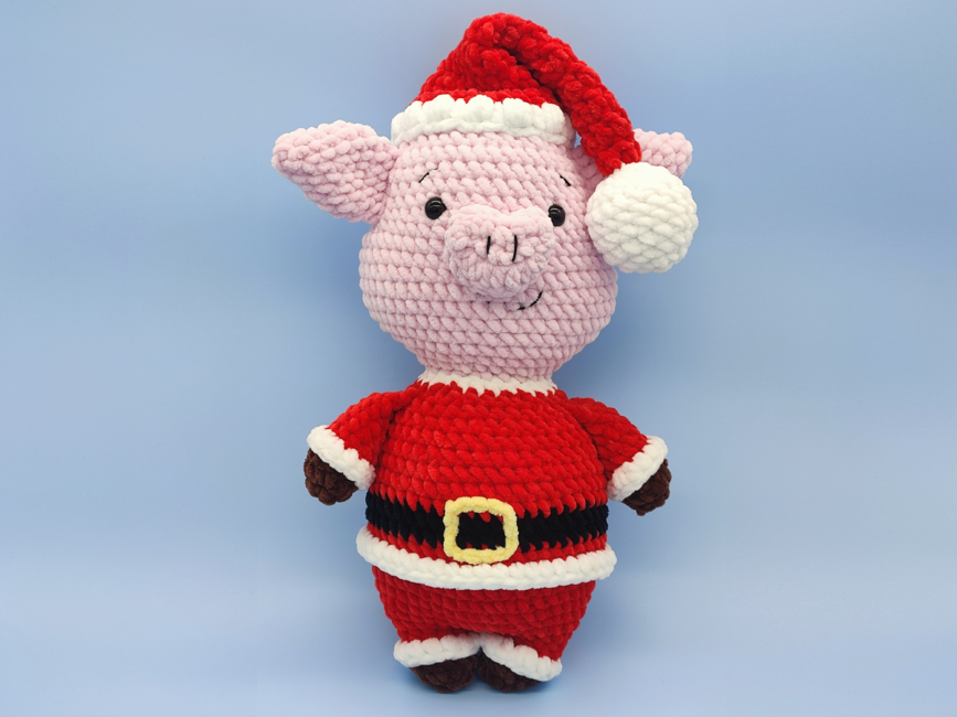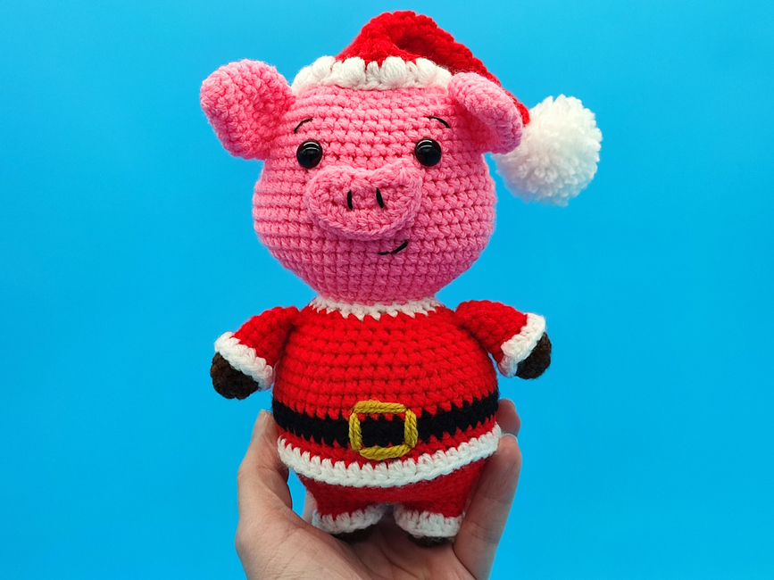 A Father Christmas low-sew Pig pattern, perfect as a plush stuffed animal toy for kids or a Christmas decoration, this DIY Santa pig project includes step-by-step crochet instructions and photos, making it easy to follow for beginner to intermediate crocheters. This pattern is compatible with most yarn types: use lightweight cotton for a small decoration, or chunky plush yarn for a larger, cuddly finish!