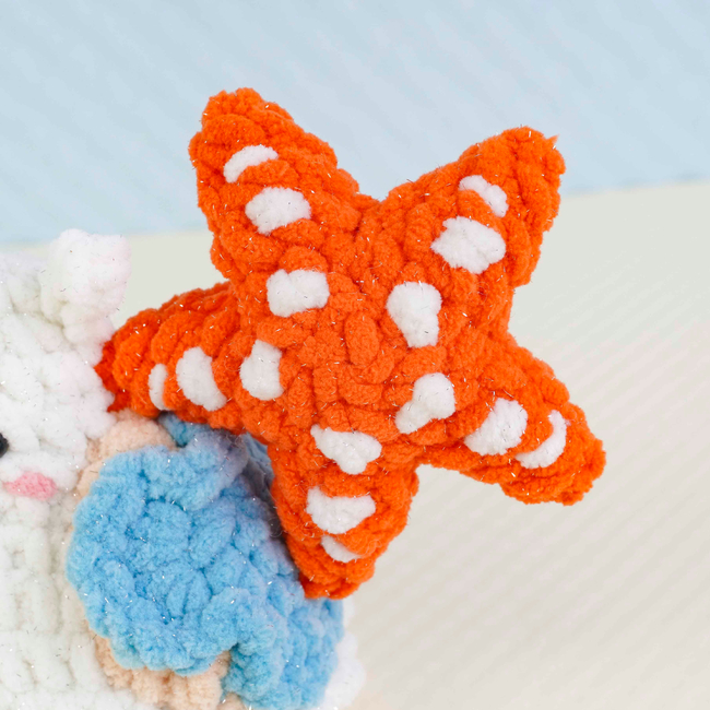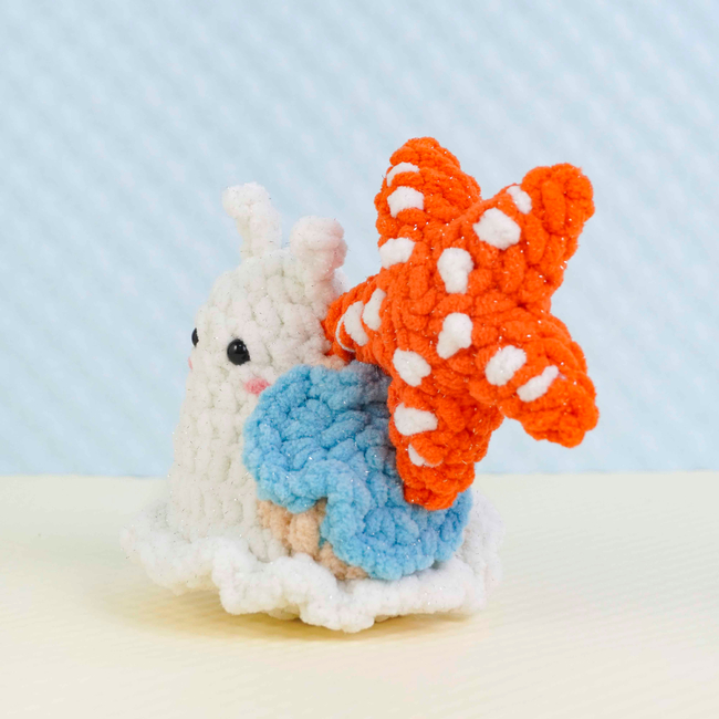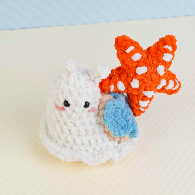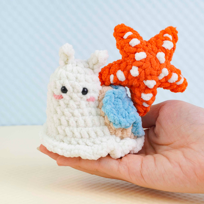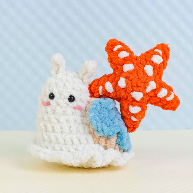 To make Star Fish Snail Crochet Pattern you will need: Color: White, orange, beige, blue, and a small amount of pink, Stitch markerSewing needleScissorsPlastic safety eyes (6mm x2)Fiberfill. Tools required: 4.0mm.