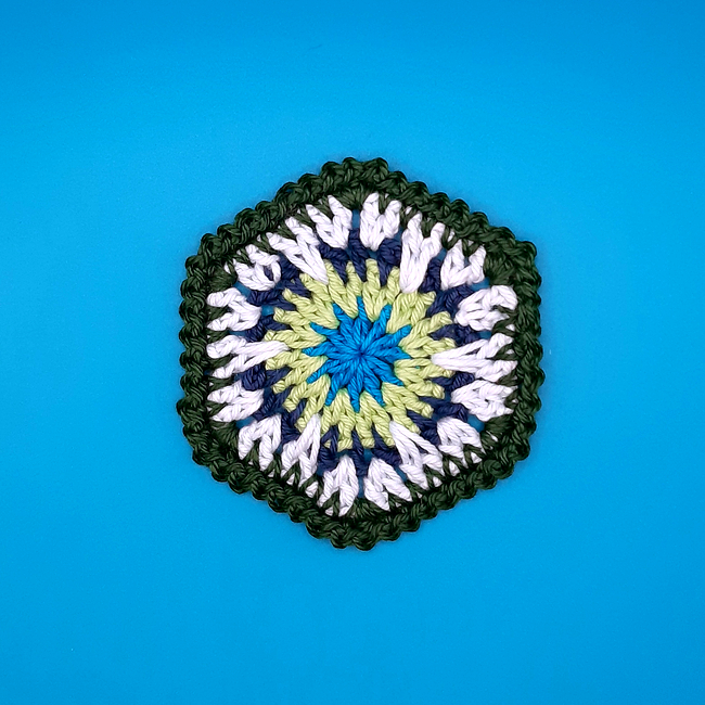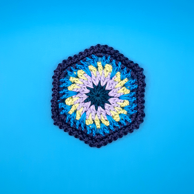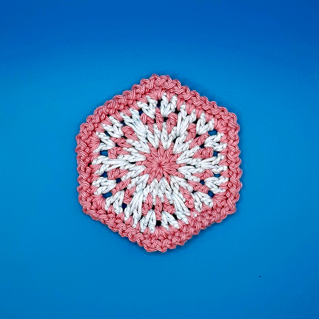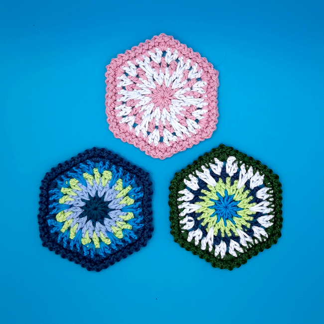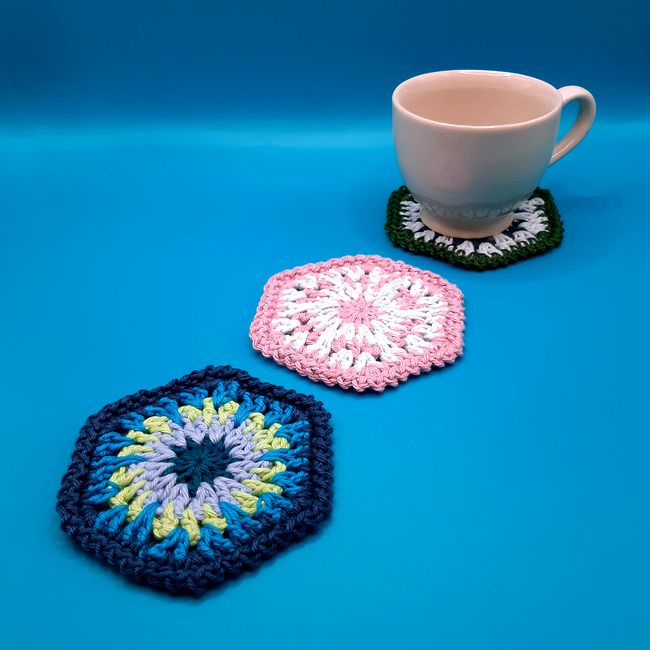 The size of this coaster works well with light or medium weight yarns. DK or light worsted weight yarn and a 4mm hook gives a coaster approximately 4 inches across. Use heavier yarn if you would like a bigger coaster. You will need between 2 and 5 different colours.