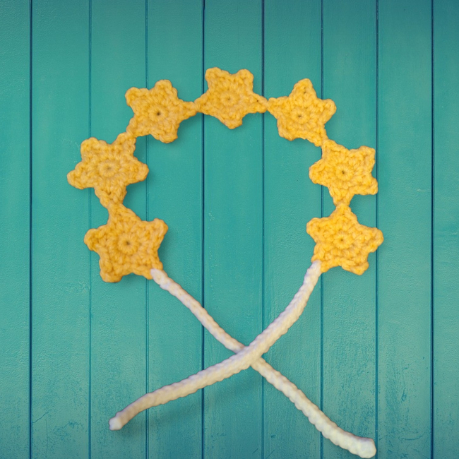To make Starry Headband (no-sew) you will need: Star color, Ties. Tools required: 4mm, Yarn needle, Scissors.