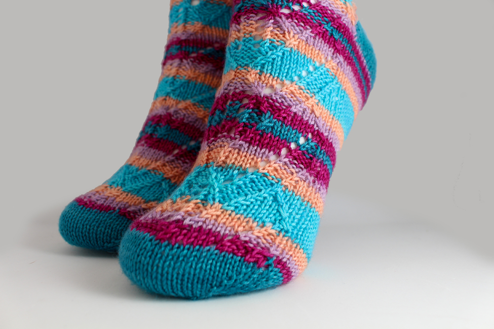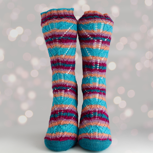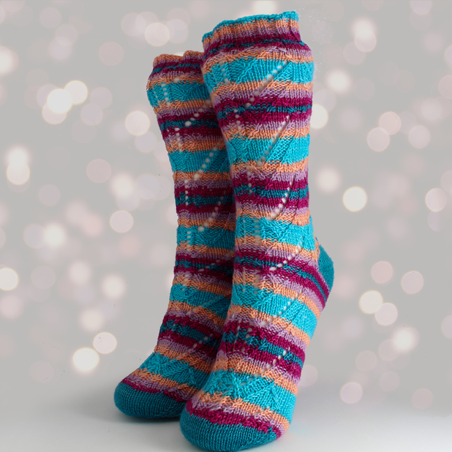 Worked in the round, Stephanie contains both cuff-down and toe-up written directions and a chart for the pattern stitch. The pattern has instructions for an afterthought heel, but you may substitute whatever heel you enjoy using.