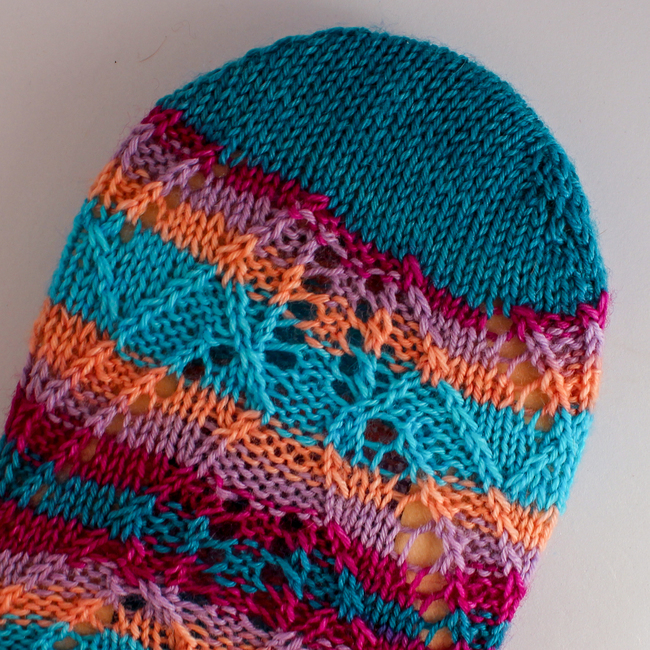 The pattern is written for the magic loop method for knitting socks; however, the design could be worked on double-pointed needles or mini-circulars instead should you prefer.