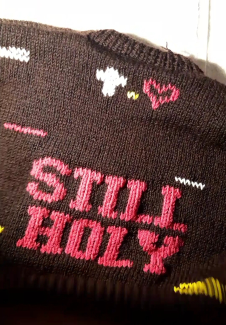This pattern does not contain the pattern for the sweater, just the grid for the inscription "STILL HOLY".
