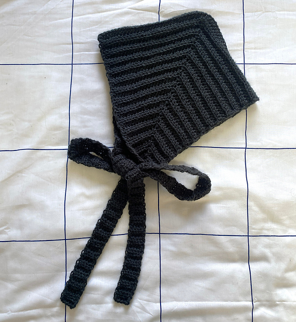 The bonnet is crocheted in one piece, back and forth, with shaping created through increases in the middle of the work. The first and last stitches are always crocheted through both loops of the stitch below, while the rest are crocheted through the back loop of the stitch below. There is no difference between the front and back sides of the bonnet.
