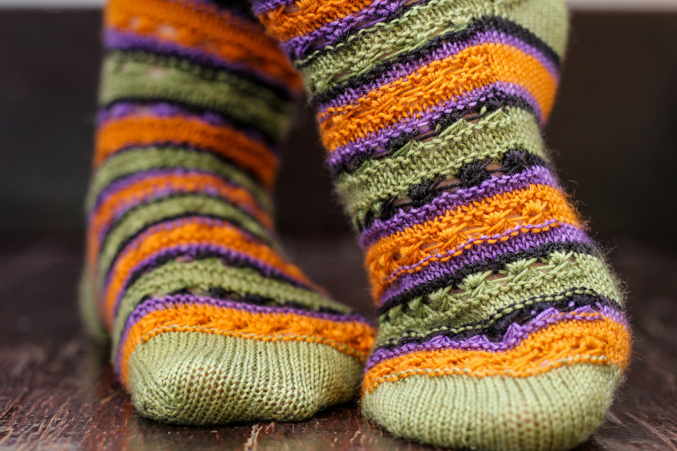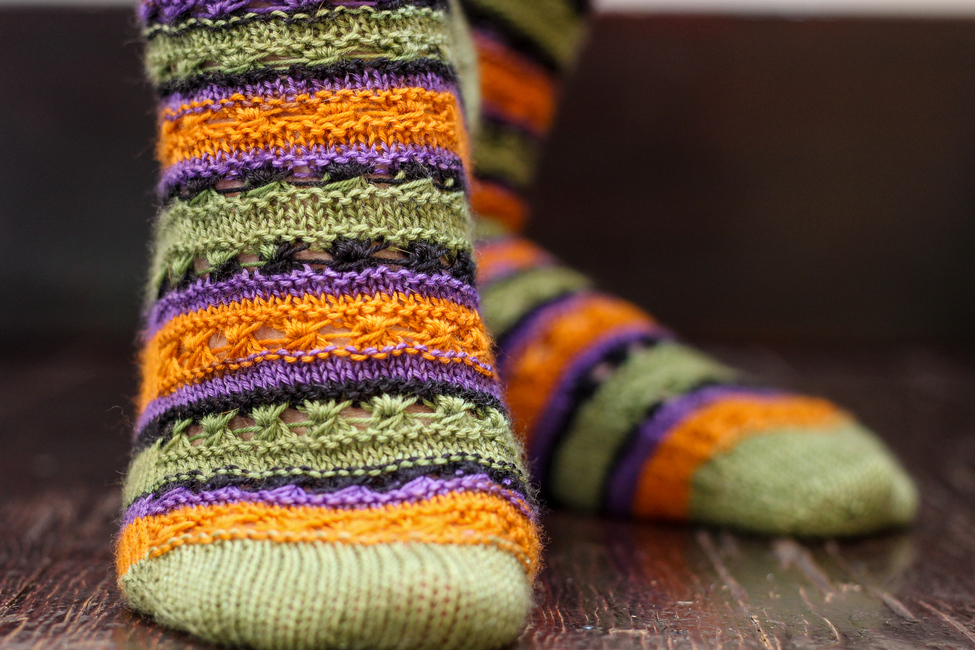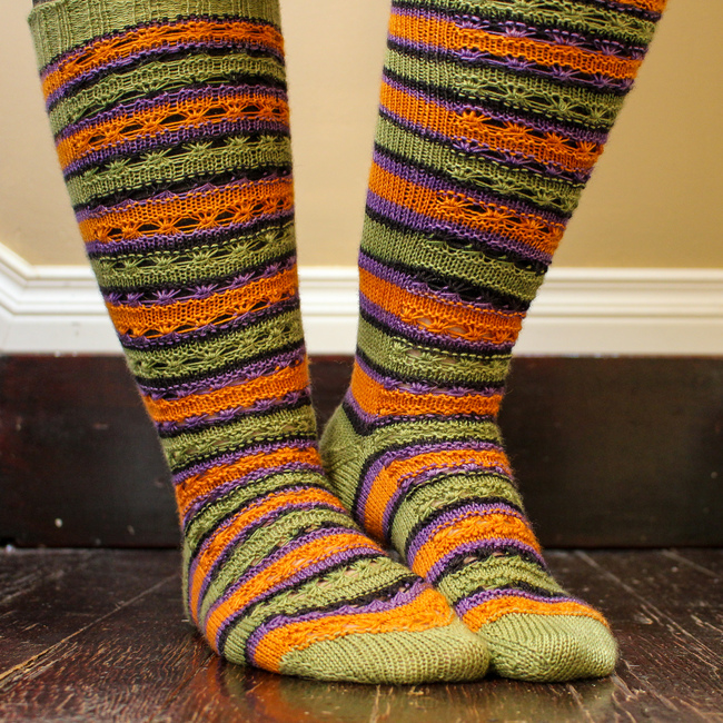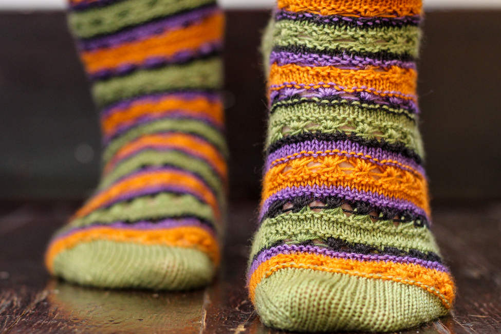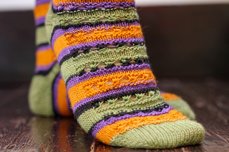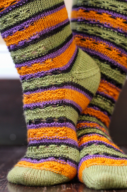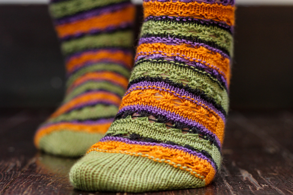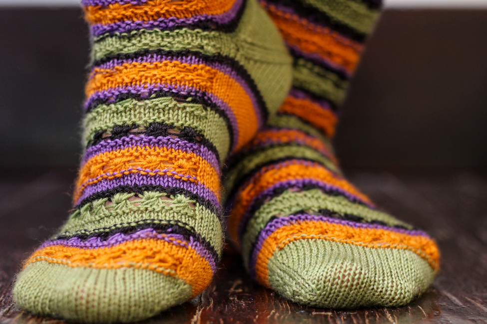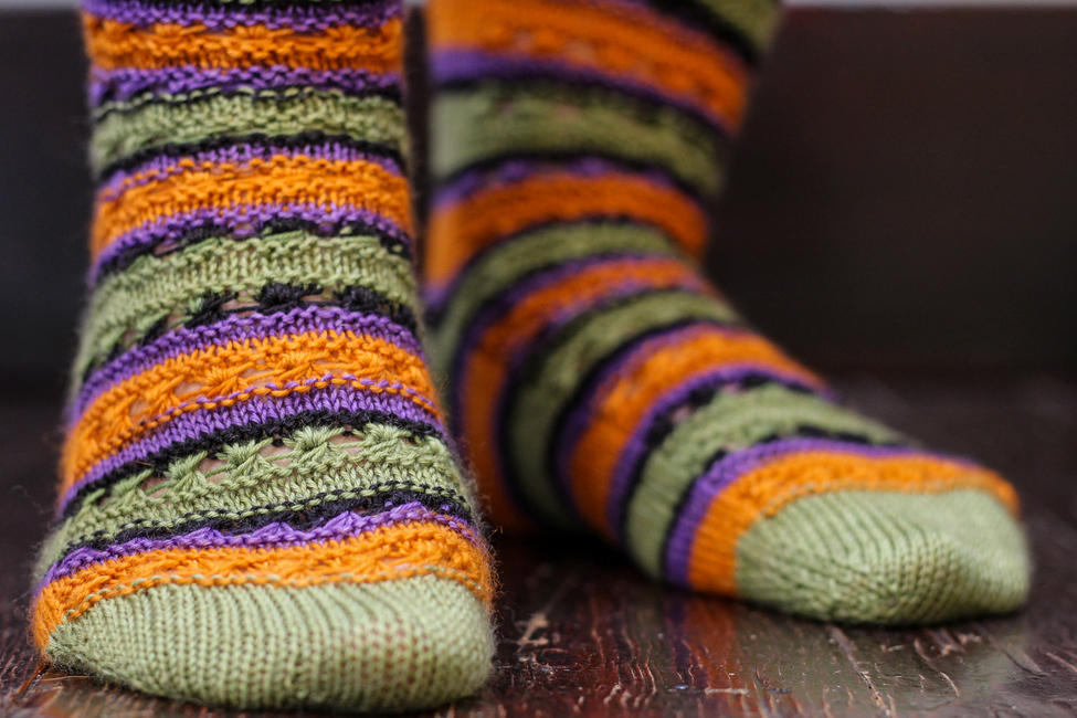 Worked in the round, Strange Magic contains both cuff-down and toe-up written directions and a chart for the pattern stitch. The pattern has instructions for an afterthought heel, but you may substitute whatever heel you enjoy using.