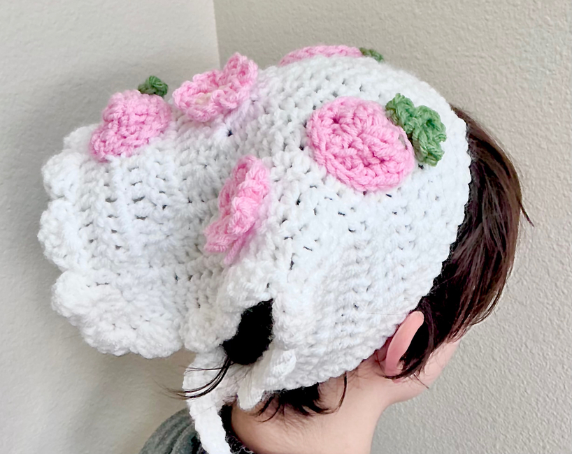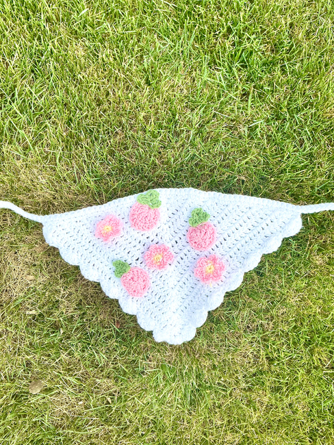 The Yarn Yeti designed the Strawberry fields bandanna pattern. Find more of their patterns on their Ribblr shop page.