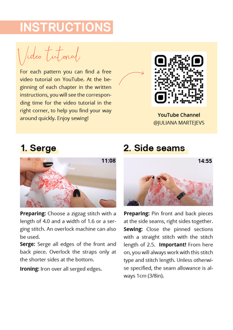 Use the video sewing instructions to the pattern and sew along step by step with Juliana. If you've never sewn before, watch the sewing machine basics video tutorial first. There you will learn about the components of a sewing machine and how to sew your first seam.