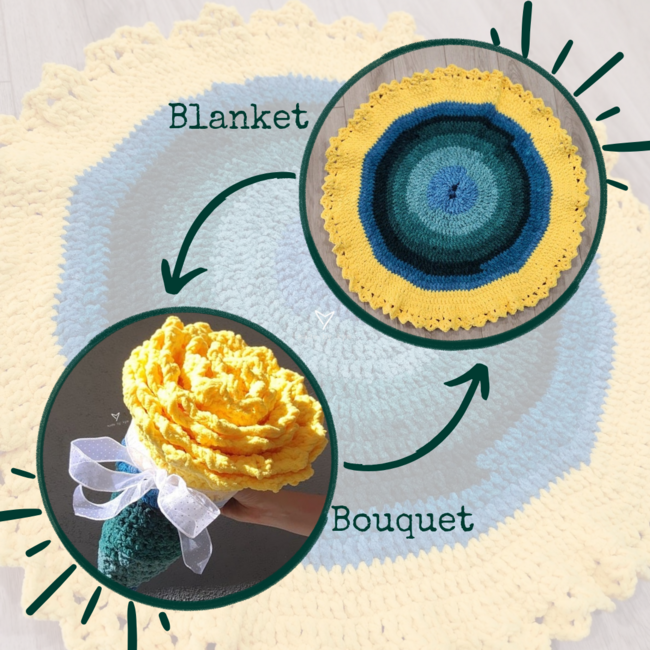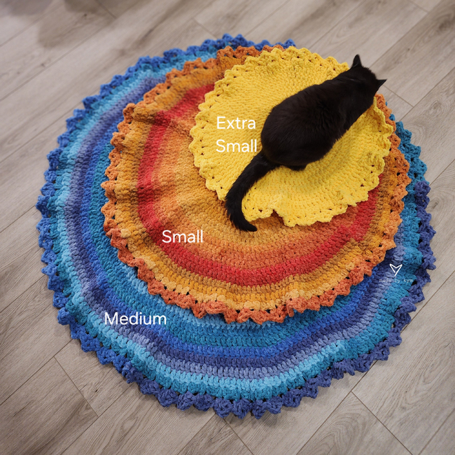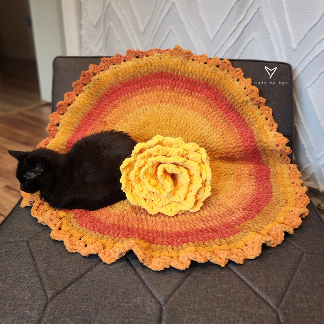 A sweet circle blanket with a detailed border that reminds me of the sun. This design was inspired by my Goldfishie Pouch tail. The body of the blanket is an easy repeat making this a perfect make for binge watching your favorite show. I have yardage and instructions for 3 different sizes (pet, baby, and lap blankets). The seamless circle makes this an Intermediate pattern, but an advanced beginner can also handle this design. As a bonus, this blanket rolls up to look like a succulent or flower!