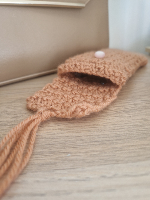 To make SUN/GLASSES CASE you will need: Caramel dk aldi yarn. Or any dk yarn will be fine., The button I used came from an assorted pack in hobbycraft..