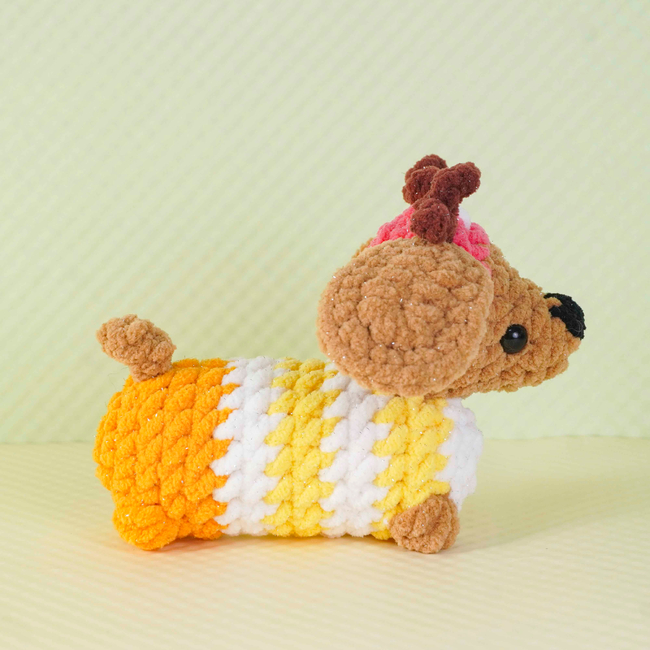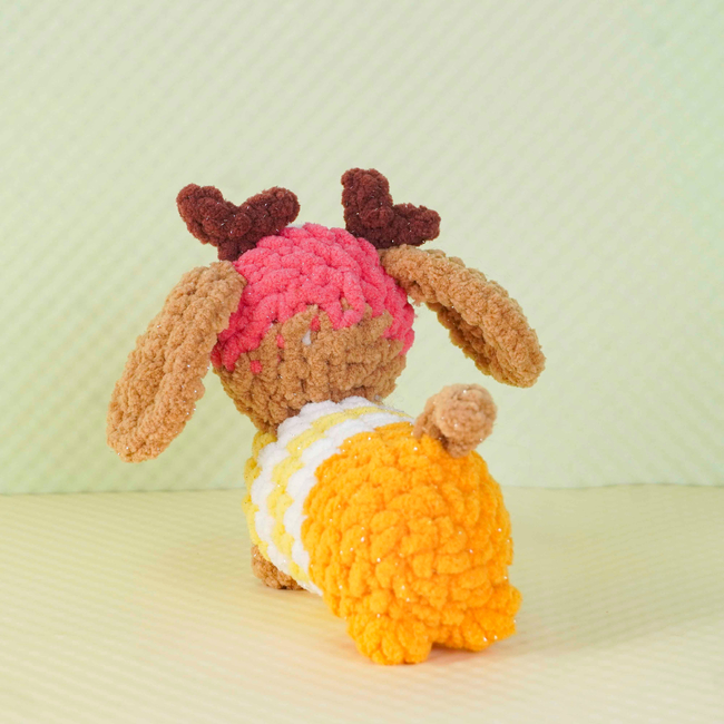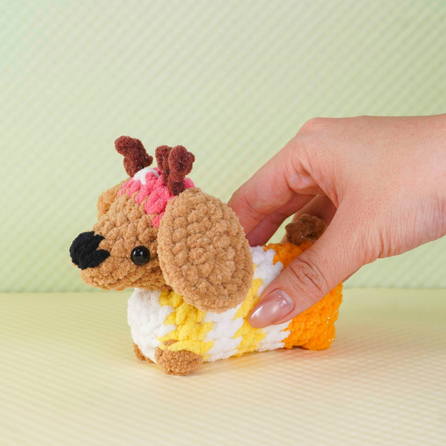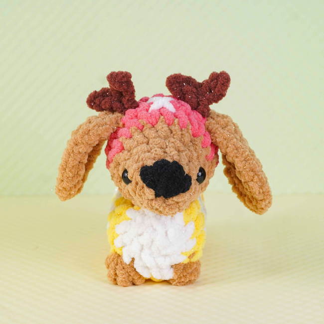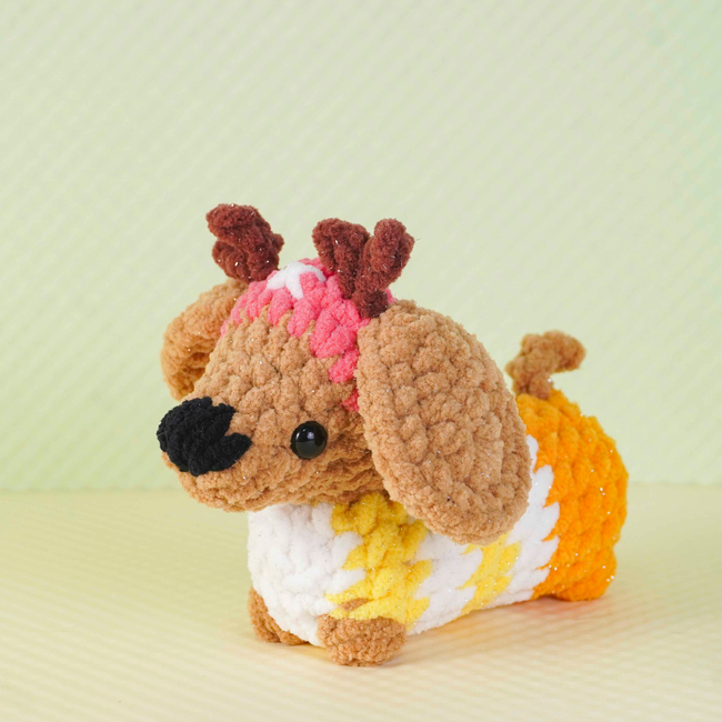 The Sunny Antler Dachshund Crochet Pattern pattern makes a Amigurumi. It is a Intermediate Crochet pattern.