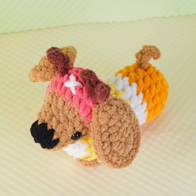 To make Sunny Antler Dachshund Crochet Pattern you will need: Color: Brown, Dark Brown, Dark Pink, Yellow, Orange, White, Black, Stitch marker Sewing needle Scissors Fiberfill Plastic safety eyes (8mm). Tools required: 4.0mm.