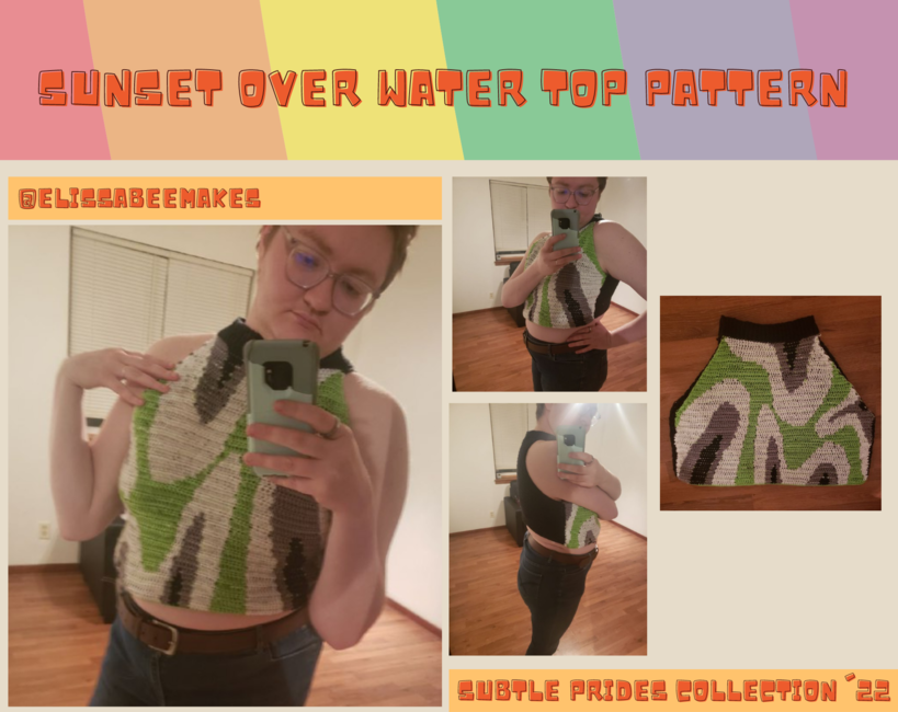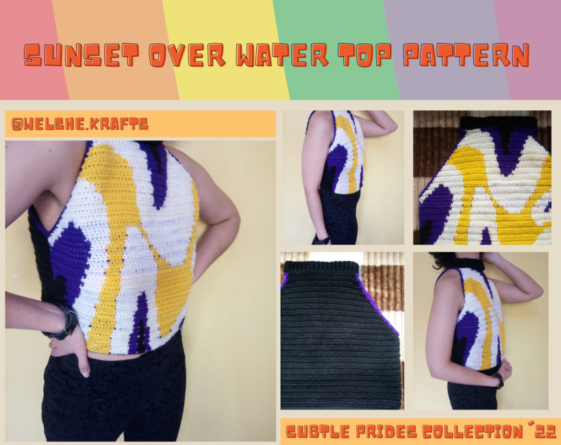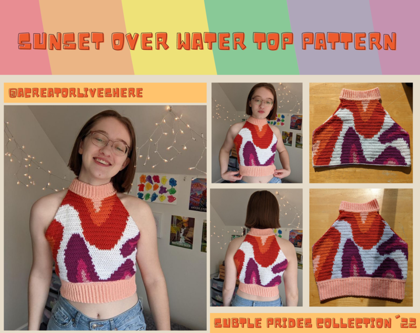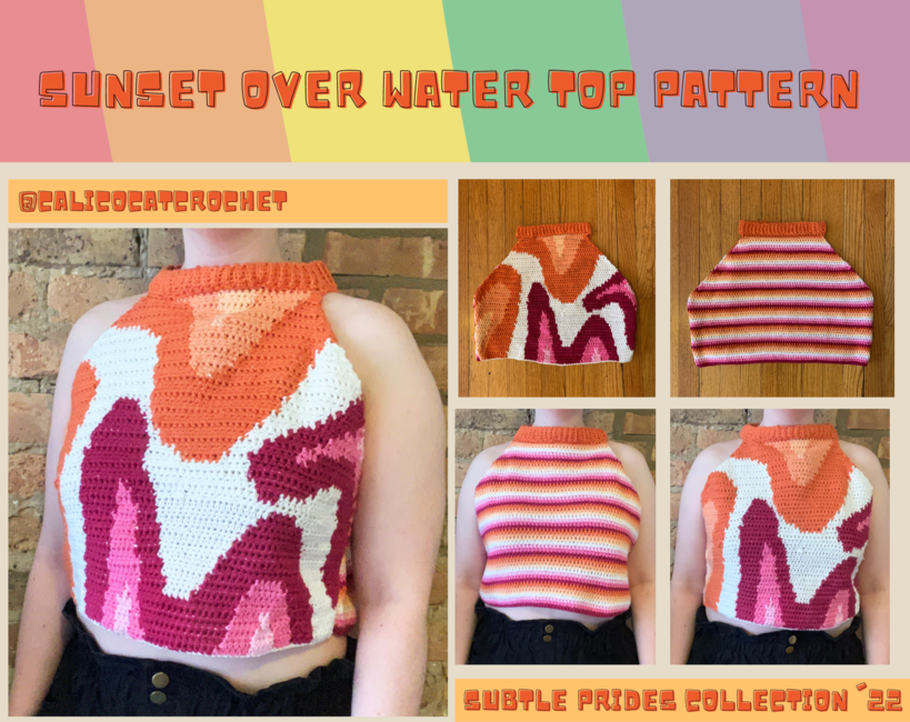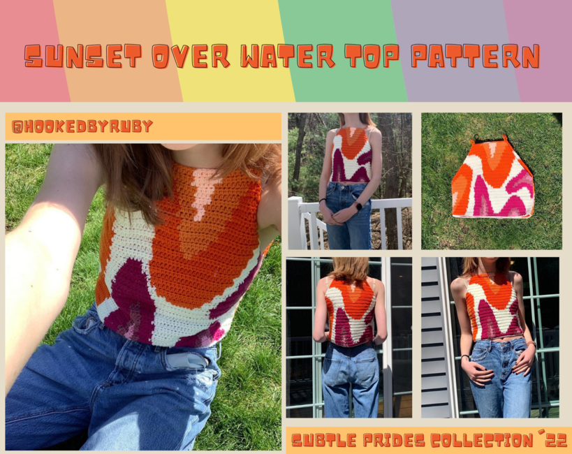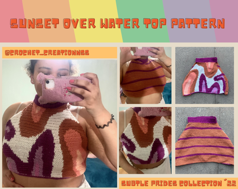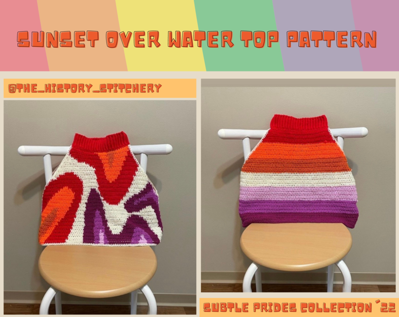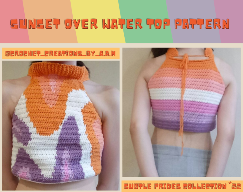Hello, and Happy Pride 2022! Thank you so much for purchasing the Sunset Over Water Pride Top pattern. This is part of my Subtle Prides Collection for Pride Month '22! This is a super cute halter top with a ribbed mock neck, with a groovy-inspired version of the Lesbian/MLM/Agender Pride Flags in 6 different sizes. The colors used in the pattern correspond to the Sunset Lesbian pride flag, but you can adapt the pattern to recreate a groovy-inspired version of any pride flag that has 7 colors (like the MLM and Agender flags) simply by changing the colors! This top is originally a cropped top, but the pattern includes optional instructions to adjust the length. The pattern also includes instructions for creating either the original version with a back panel, or a backless version. This pattern uses hdc stitches and tapestry/colorwork crochet techniques, such as carrying yarn as you crochet, and switching color yarns throughout the pattern to create the groovy design, so this is the perfect pattern for someone with an intermediate to advanced level.