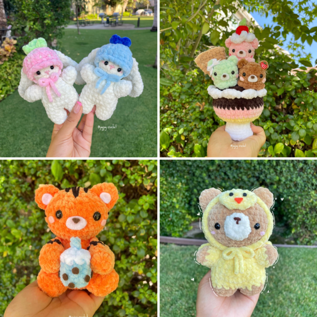 The Sweet Baby Animals bundle includes 4 patterns: Pocket Bunny, Baby Tiger with Bubble Tea, Beary Sundae, and Bear in Duck Costume! All patterns are beginner- intermediate level and any yarn type can be used. Each pattern includes all the accessories pictured above, including: the strawberry and blueberry hats for the pocket bunny, the bubble tea for the baby tiger, the waffle, the dessert toppings for the Beary sundae, and the costume for the bear. Please reach out to me via Instagram dm preferably (@jayjay.crochet) if you have any questions!