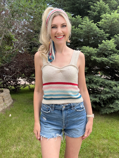 The Sweet Paulette Top is an adorable, retro-inspired summer top that features picot edging, a sweetheart neckline and fabulous picot sleeves! This top may be knit with stripes (as listed in the pattern), or as a solid or gradient. Alternatives to this pattern include Icord straps and adding elastic to the back ribbing.