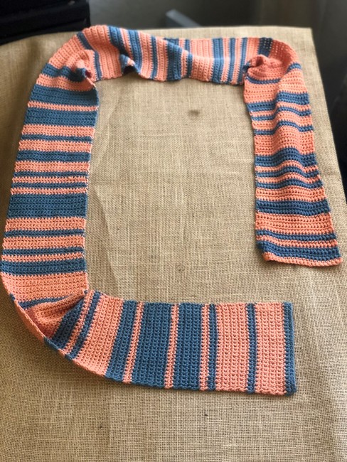 This simple scarf is crocheted using 2 contrasting colours. The unique aspect of this scarf is that the stripes are not part of a repeating pattern, they spell out