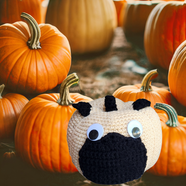 Pugkin: Inspired by my pug Bruno, this is a funny twist on the classic pumpkin pattern.
