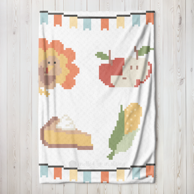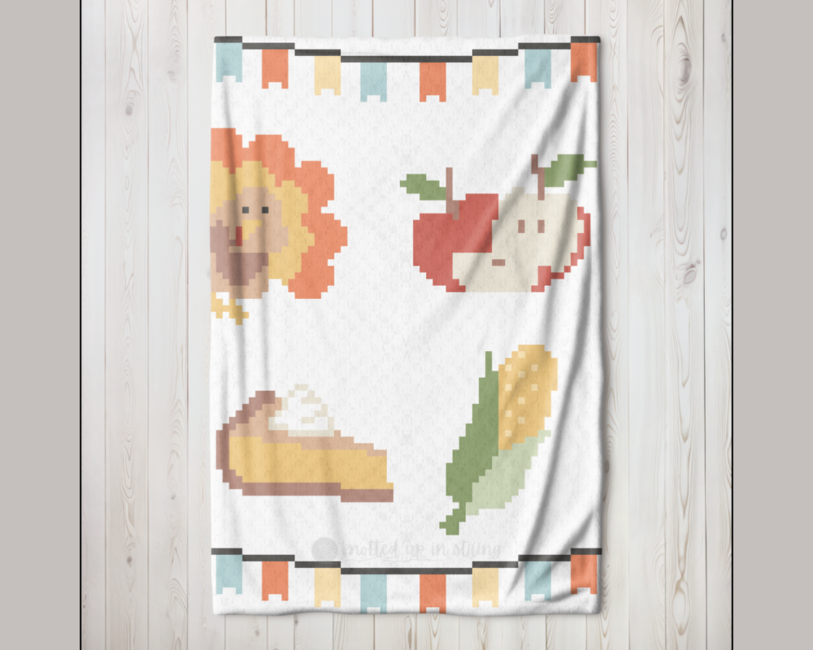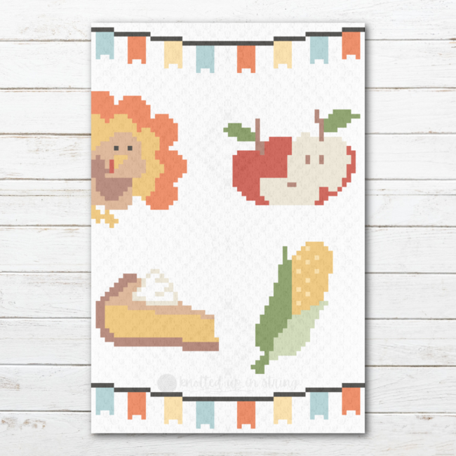 Wrap yourself in the warmth and joy of the fall season with the 'Thanksgiving Sampler' C2C blanket! This festive design captures all the cozy fall vibes, featuring classic Thanksgiving motifs like a cheeky turkey (perhaps hiding so as not to become your dinner?), a delicious slice of pumpkin pie, just-picked apples ready to become stuffin or pie, and a bright corn stalk, all bordered by a colorful, playful pennant bunting. It's the perfect blanket to snuggle up with as you celebrate the holidays or to give as a thoughtful, handcrafted gift to a loved one who adores the magic of fall and family gatherings.