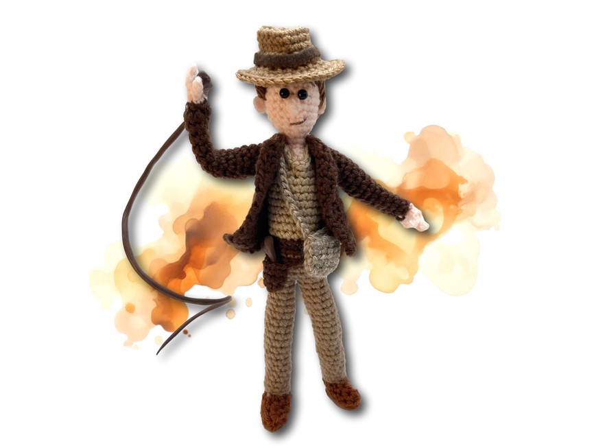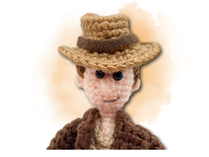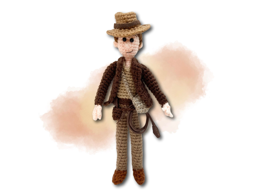 Dr. Jones: The Man. The Myth. The Fedora. This ode to cinema's greatest adventure hero is worked in DK weight yarns, with wired limbs to aid in cracking a whip, outwitting Nazis, drinking from the Holy Grail and getting the girl. This pattern includes more than 30 colour photos and one video link to help you along the way. This pattern is suitable for crocheters with some experience.