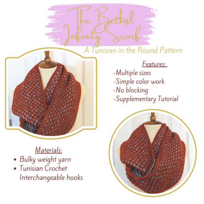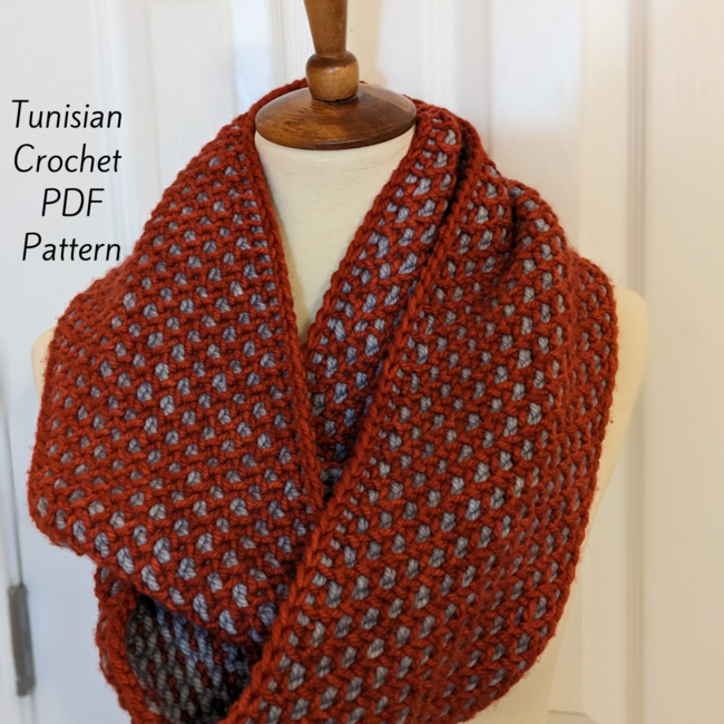Explore your Tunisian Crochet Skills with Tunisian in the Round! This infinity scarf is worked entirely in the round, features the Tunisian Honeycomb stitch, and is easily customizable for a perfect fit.