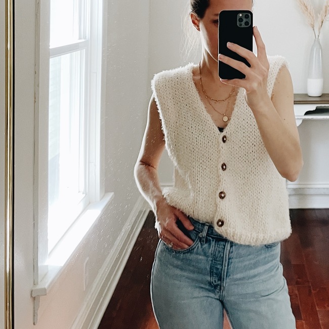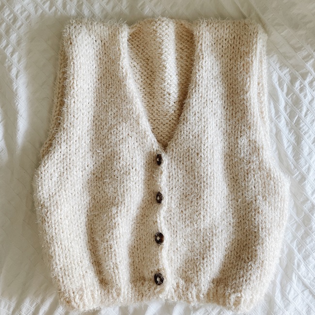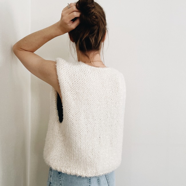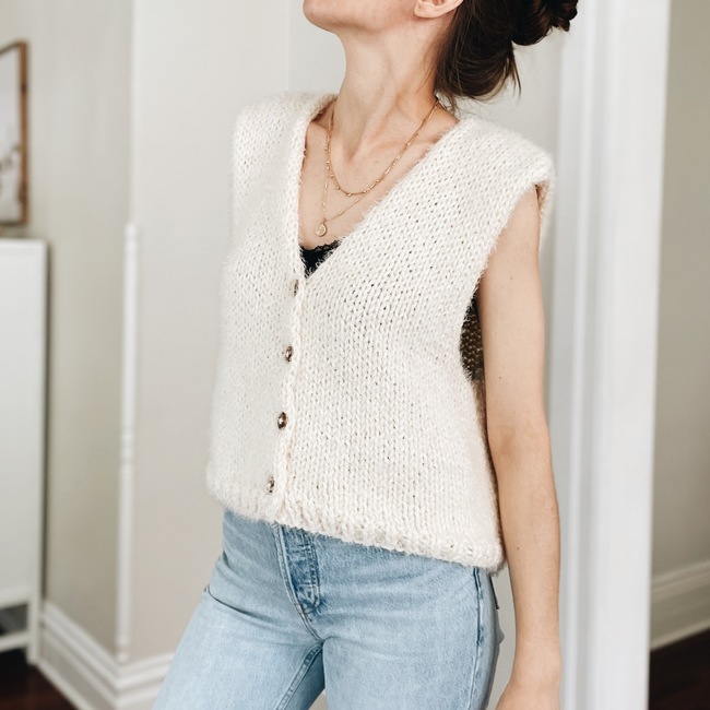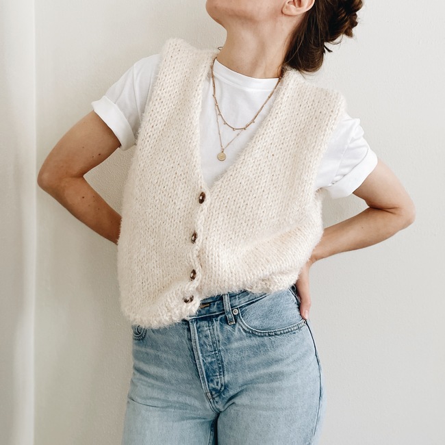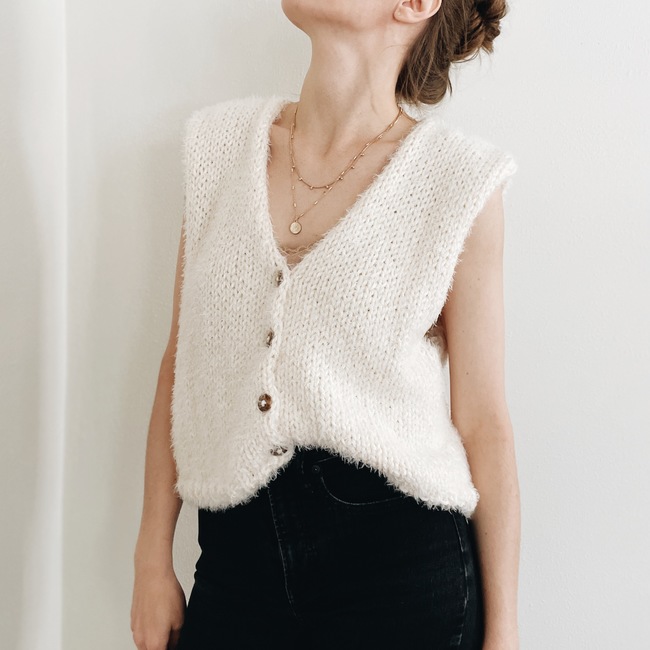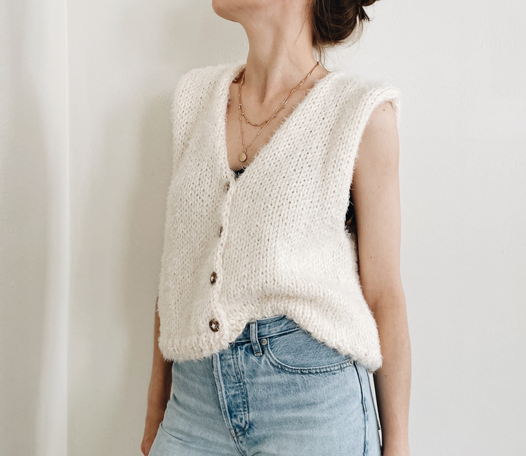 The Beverly vest is a simple to knit sleeveless v neck sweater with a relaxed fit. Easy to style and layer. Works up quick with the use of basic stitches and shaping.