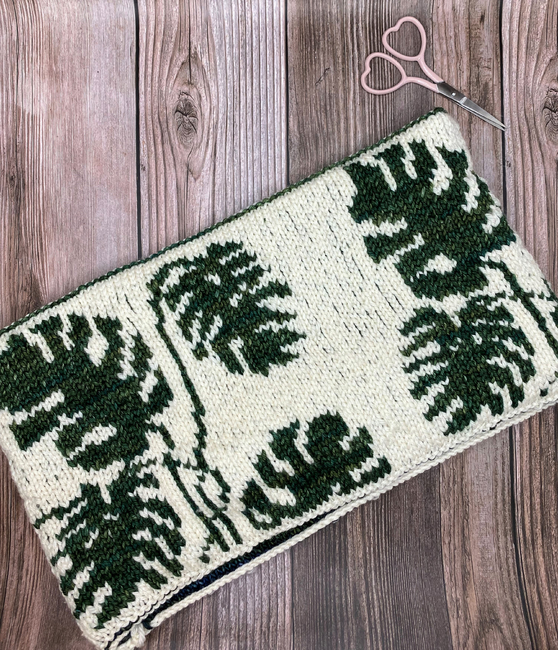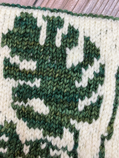 Bringing together both of my loves, knitting and houseplants. This cowl is stylish, warm, and has a beautiful Monstera Deliciosa leaf motif. It is reversible with a simple solid color on the inside hiding all of the colorwork floats in between the layers.