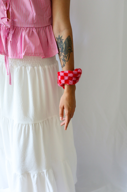 The Disco scrunchie is the perfect knitting pattern for beginners who want to step up their colour work. It's knitted flat in stockinette and then seamed together. More advanced knitters can work in the round with the magic loop method.