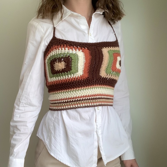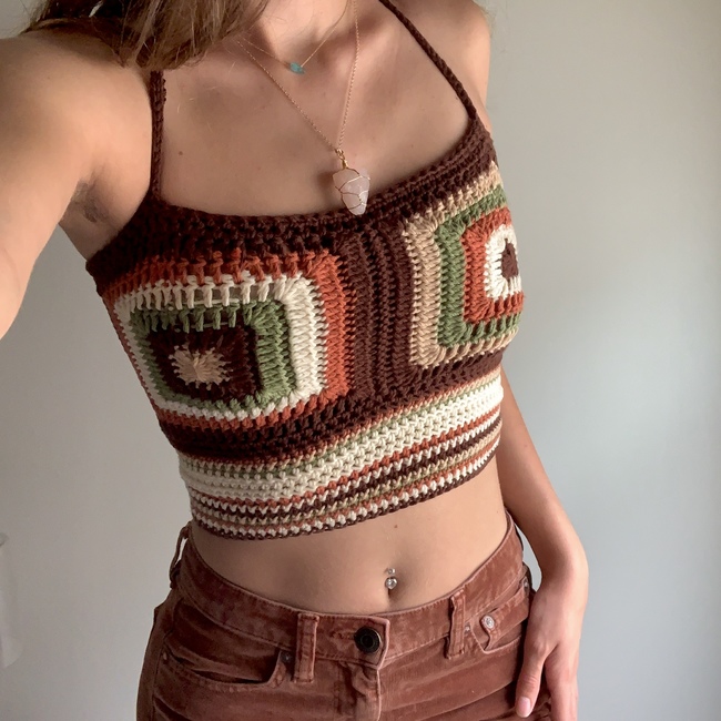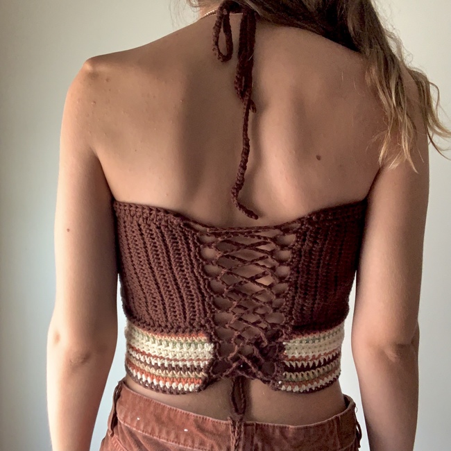 The Donna Top is great for advanced beginner and intermediate crocheters! It's retro inspired, and could be worn as a crop top for the spring and summer seasons, or layered on top of a long sleeve top for the fall and winter seasons! It has a corset back and adjustable straps to tailor to your body perfectly :)