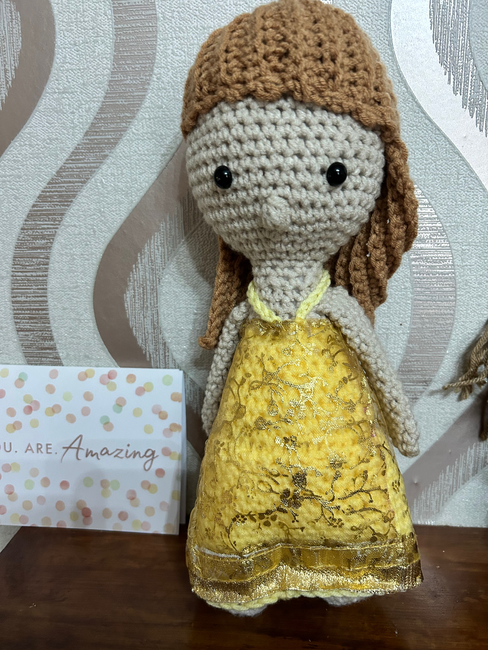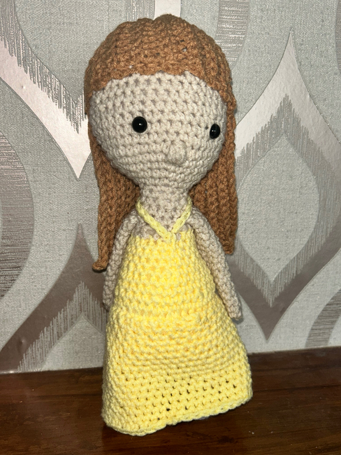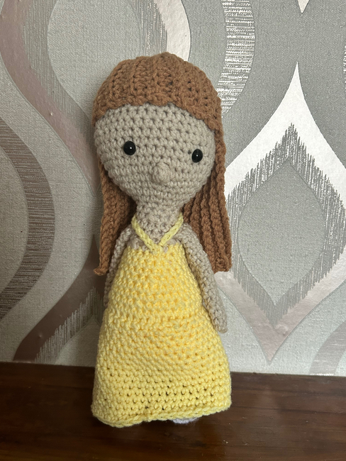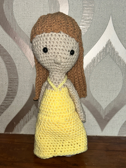 skin tone yarn, yellow yarn or dress colour of choice, brown or blonde yarn for the hair, small amount of black and pink yarn