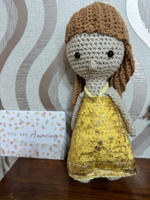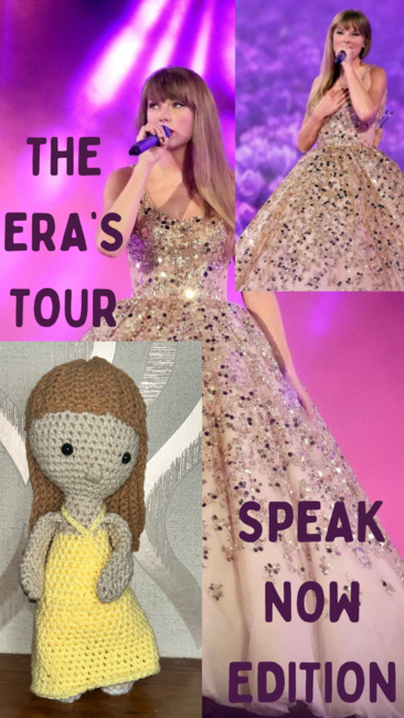 The doll is inspired by Taylor Swift's "Eras Tour" outfit from the opening night of the Speak Now section of the show. The doll is made using continuous rounds, working bottoms up. If using plastic safety eyes, secure them in place before stuffing and sewing. You may sew your eyes on; if worried about choking. Please take into account extra yardage. Before sewing please ensure you have flipped your work so that the right side is outward facing and be sure to be stuffing your work firmly.