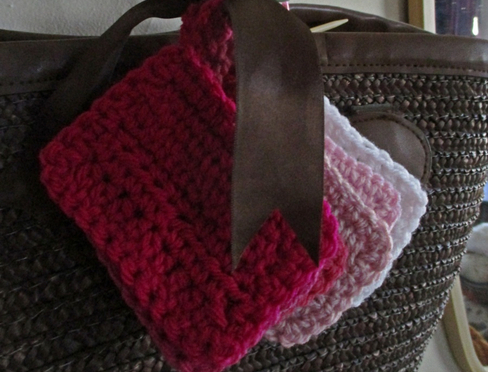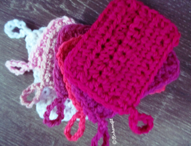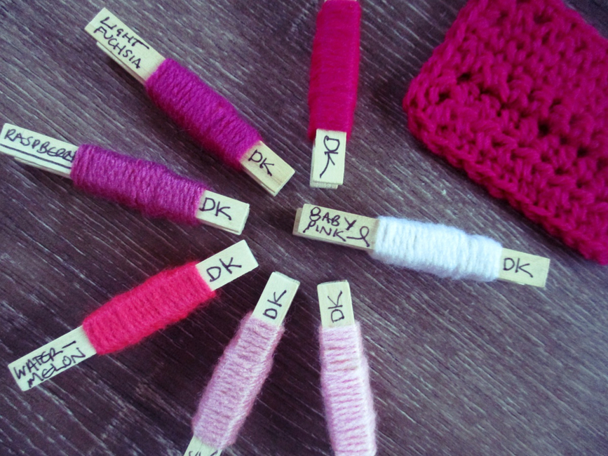 From me to you, Swatches to take in store, swatches to check for appropriate stitch/color in a project and swatch to file utilizing my readily available local Spotlight store DK garn. These can be hooked with or without a hanging loop, utilizing a few stitches in order to see a few stitches on the color swatches, these also can be used as gift tags and labels. The Swatches are (in my organizational madness - I'm a scientist :) I have divided the DK range into categories Flora and Fauna and each into subcategories. This swatch is the third of the five within the Flora Swatches focusing on swatching the light to bright pink tones in the palate. Utilize any DK range of garn that is readily accessible to you to make the project work for you.