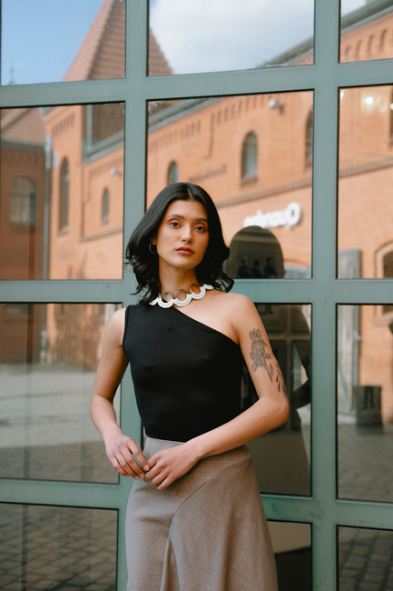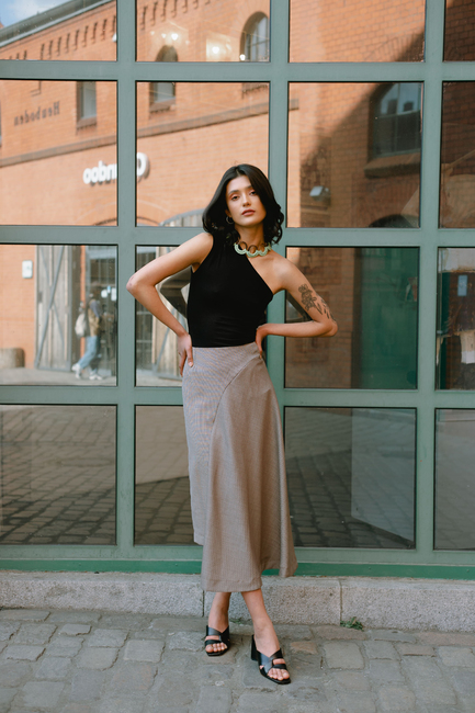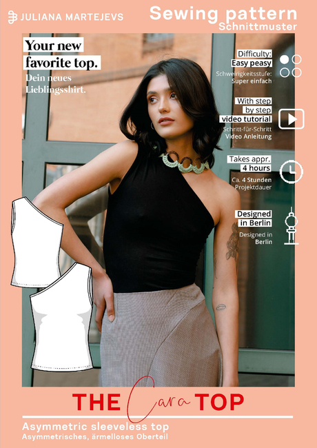 The asymmetric jersey top sewing pattern is an absolute all-rounder and super trendy at the same time: you don't have to be a professional to sew this top, the asymmetric top The Cara Top is easy to sew with jersey and is therefore also suitable for sewing beginners. The summer top sewing pattern is characterized by its asymmetrical neckline and can be combined endlessly, e.g. with shorts patterns or a playful mini skirt pattern.