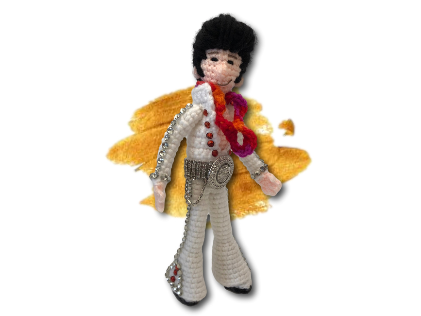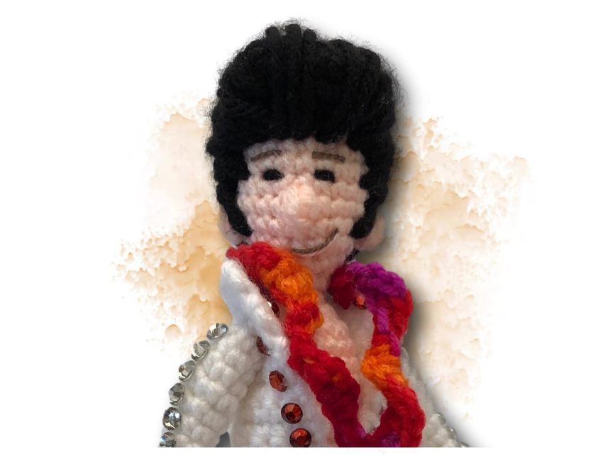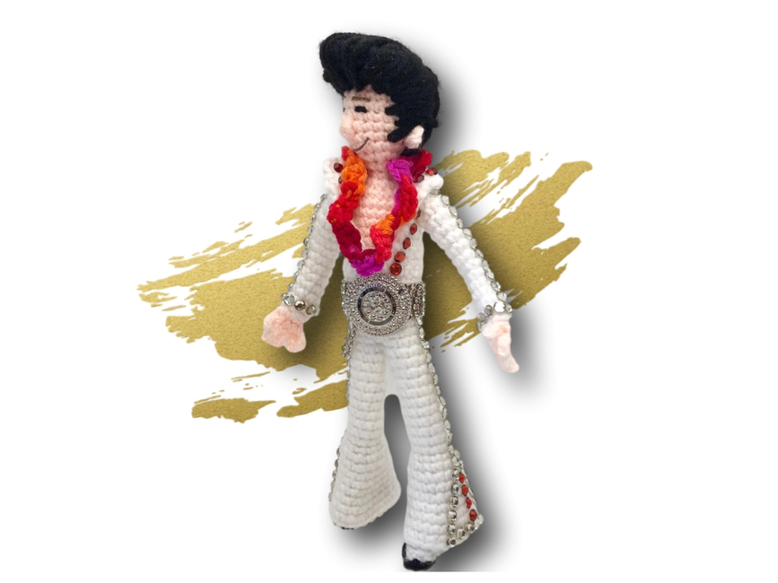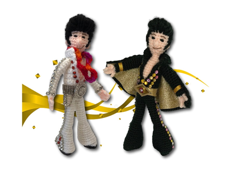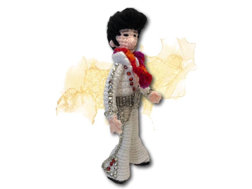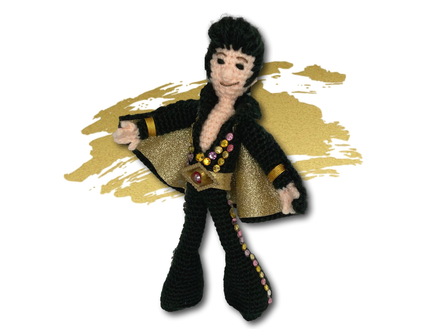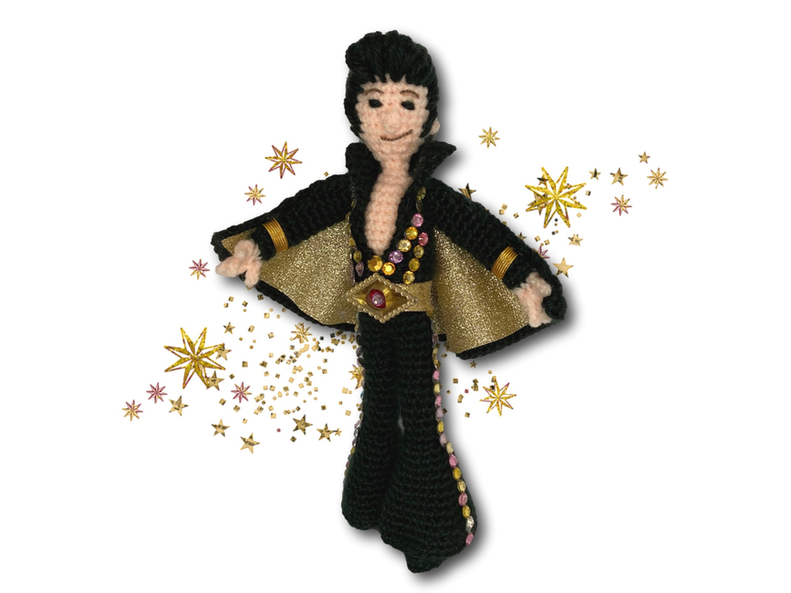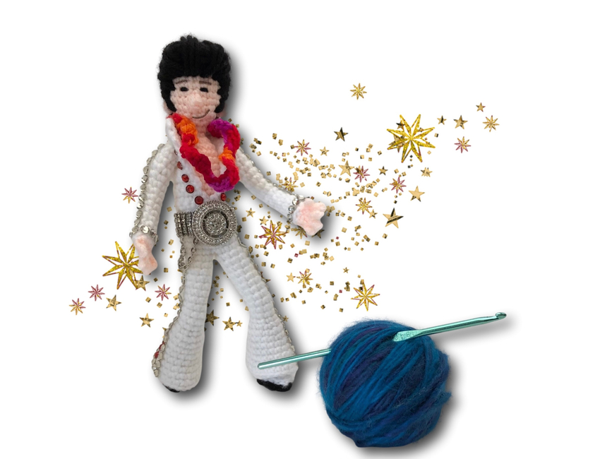 Crafted in the rhythm of only three yarn colors, you can't help falling in love with this crochet creation! With wired limbs for maximum pelvic gyration, this pattern works up faster than an Elvis hip shake, making it the perfect gift for that Elvis-loving rocker in your life. This pattern includes over 20 colour photos and is suitable for crocheters with some experience, a hunka hunka burning yarn love just waiting to be crafted. So, put on your blue suede crochet hook and let the crafting begin!