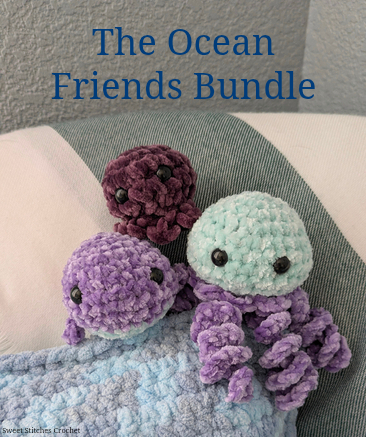 This is a bundle of my 3 ocean amigarumi stuffies; Wally the whale, Otto the octopus, and Jolene the jellyfish. The skill level for all of these patterns is intermediate-begginer. Make sure to create a journal so I can see your finished projects!