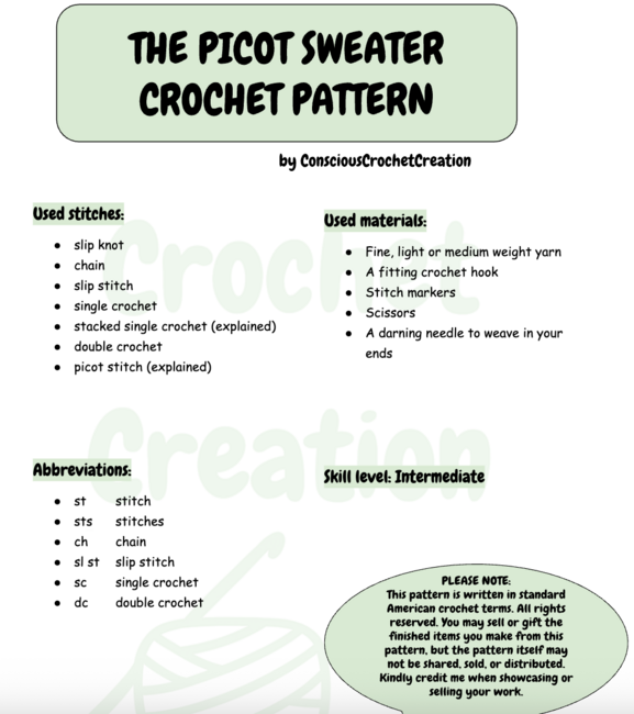ConsciousCrochetCreation designed the The Picot Sweater pattern. Find more of their patterns on their Ribblr shop page.