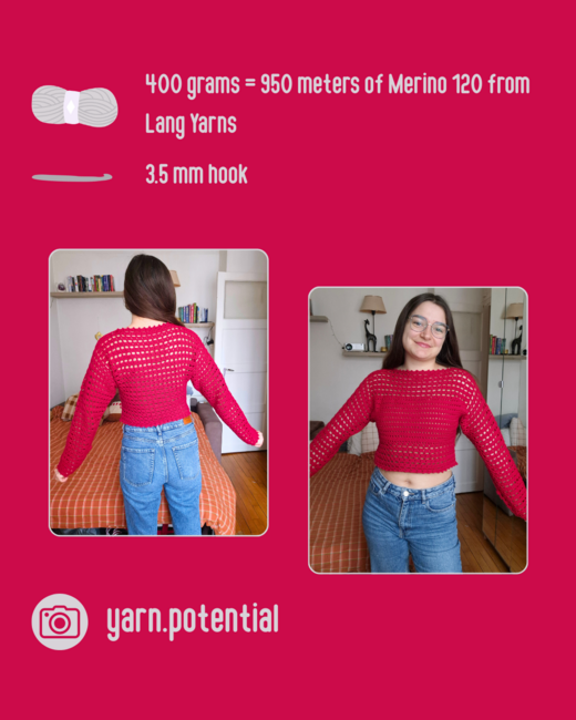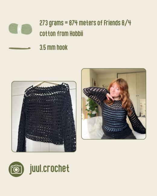 The pattern includes step-by-step written instructions, explanations of the special stitches, and helpful photos to guide you through the process. You will have access to an interactive pattern on Ribblr, but you will also be able to download a PDF-file of the pattern, and a PDF-file of the testers gallery. I have used approximately 220 grams/748 meters of Cotton 8/4 from WE LOVE YARN (100% cotton) and a 3.5 mm crochet hook. In the testers gallery, you will find notes on what yarn they all used.