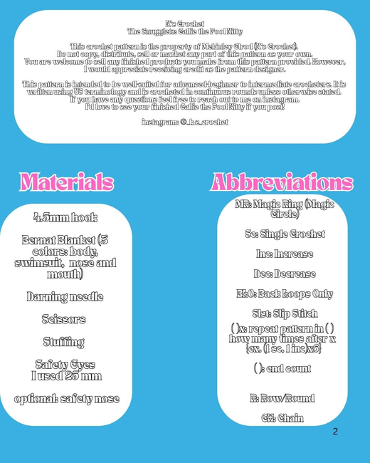To make The Snugglets: Callie the Pool Kitty you will need: Bernat Blanket in 3 colors (body, swimsuit, nose and mouth), Scissors, Stuffing, Safety Eyes (25mm), Safety nose (optional). Tools required: 4.5 mm hook, Darning needle.
