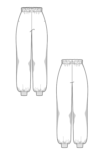Sewing pattern for loose sweatpants with elastic waistband and side pockets for sewing.