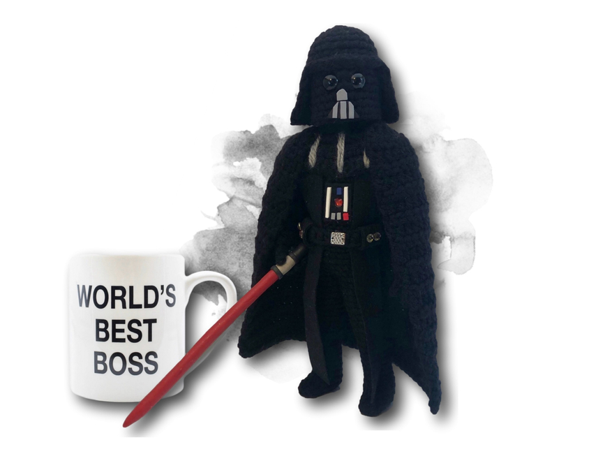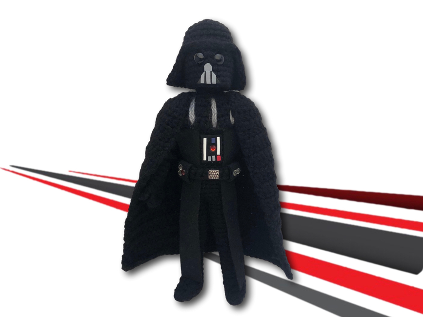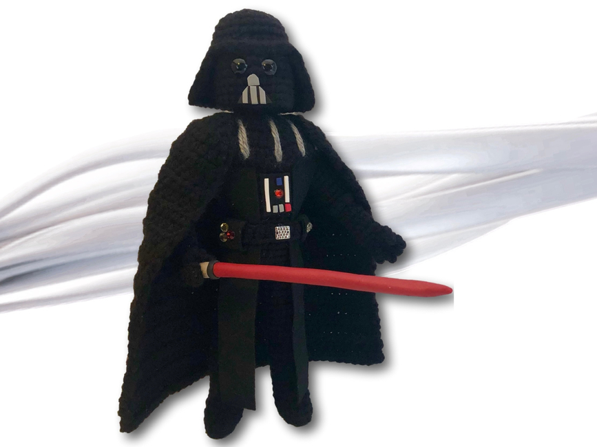 The most notorious villain in the crochet galaxy, Darth Yarn-der, is famed for his stitch-tenacity, rhythmic breathing, and, well, maybe not the best workplace etiquette. This crochet creation stitches up quickly, using just two main yarn colors. Wired limbs ensure he's ready for duels and a Force Choke, while a lightsaber made of polymer clay adds a touch of the dark side.