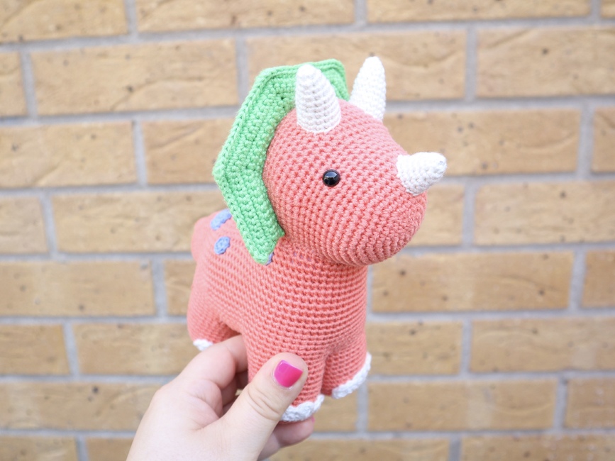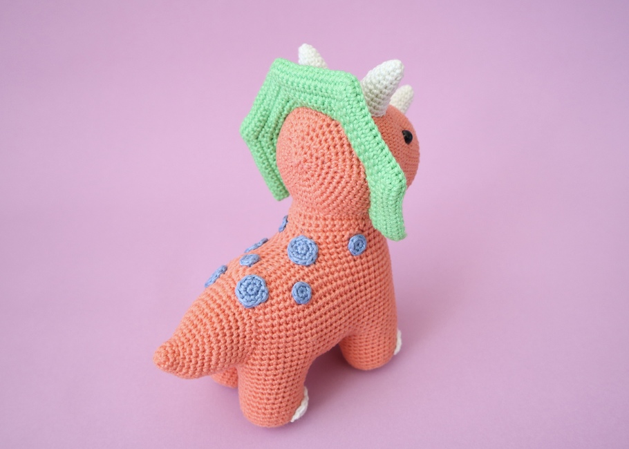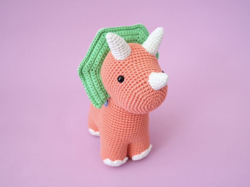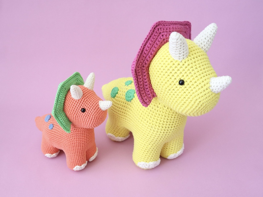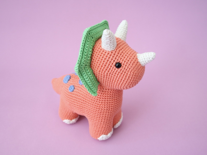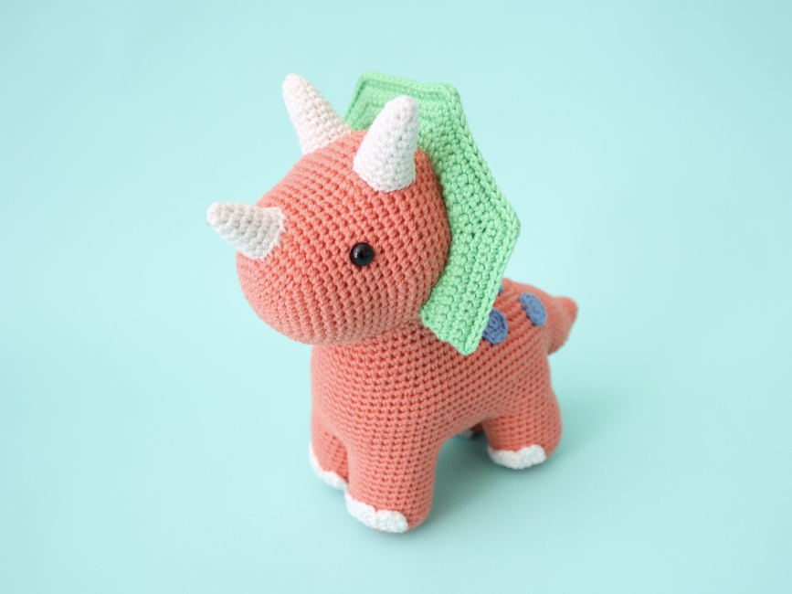 Using the materials suggested the triceratops measures 19cm tall. Any yarn can be used with this pattern with an appropriate size crochet hook to create a tight tension, although other yarns may affect the size of the finished dinosaur. Suggested materials: 4ply 100% cotton yarn, 2.5mm crochet hooks, toy stuffing and 8mm safety eyes.