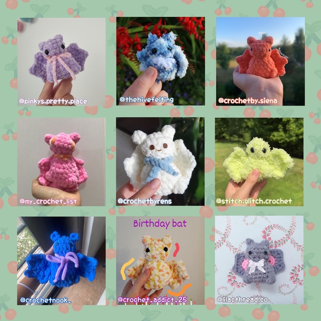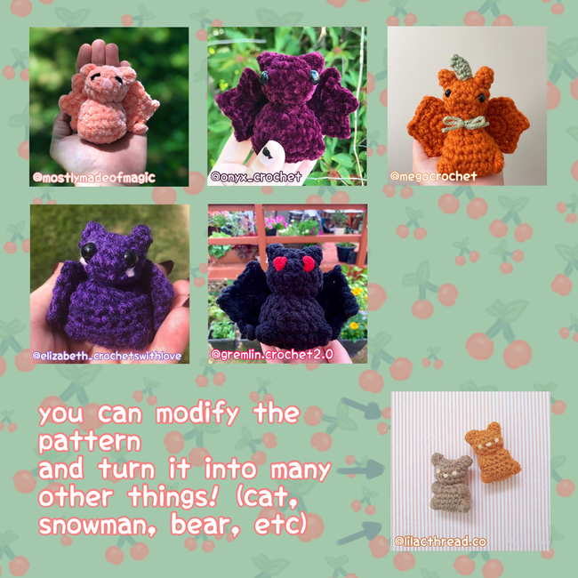This pattern will help you create your own tiny bat! If you share your tiny bat on instagram feel free to tag me (@cherrcrochets), Id love to see them!!