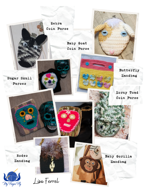 Crochet purse patterns for any occasion for yourself or your daughter. Crochet a Butterfly Handbag in her favorite colors, the small Mia Handbag to match her outfit, a Unicorn Fanny Pack to go for a walk, a cute Horny Toad Coin Purse for the lizard lover in your family, a baby gorilla purse, Zebra or Baby Goat coin purses, or three different sugar skull styles. Each purse works up quickly with less than a skein of worsted weight yarn. Use a larger or smaller hook to change size of purse. The color possibilities are endless. Ten unique purse designs to fit your every mood!