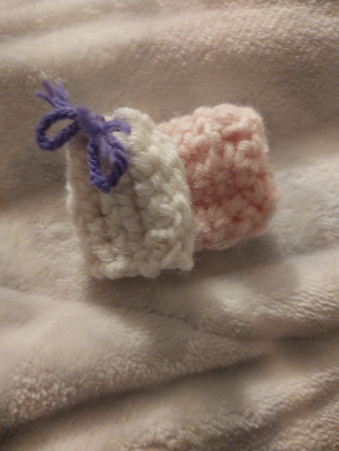 To make Tooth fairy bag you will need: Red heart super saver medium acrylic light pink, Red heart super saver medium acrylic purple. Tools required: Any darning needle will work.