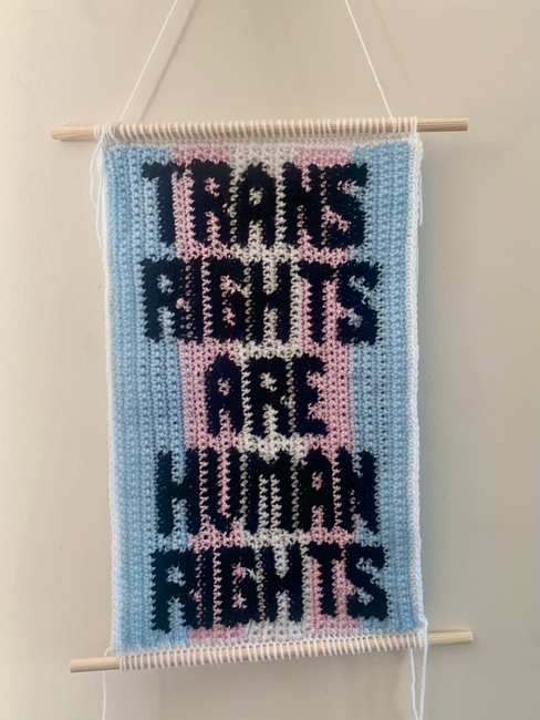 Beginner/intermediate crochet pattern for 'Trans Rights'. Text says 'Trans Rights are Human Rights'. Easy pattern if you are comfortable with colour changes.