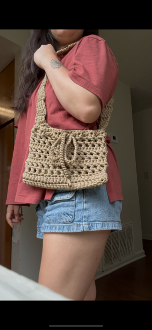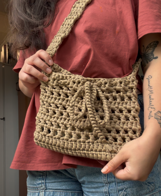 This bag is made with t-shirt yarn, but can also be recreated with any other type of yarn as well! The size will vary based on the type of yarn! It works up pretty fast and can easily be altered to make bigger/smaller based on your preference :-)