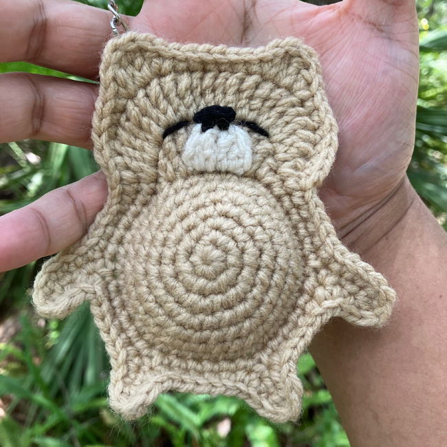 Tummy Bear is a no-sew pattern of a bear with a stuffed tummy who can be used as a stress toy or keychain.